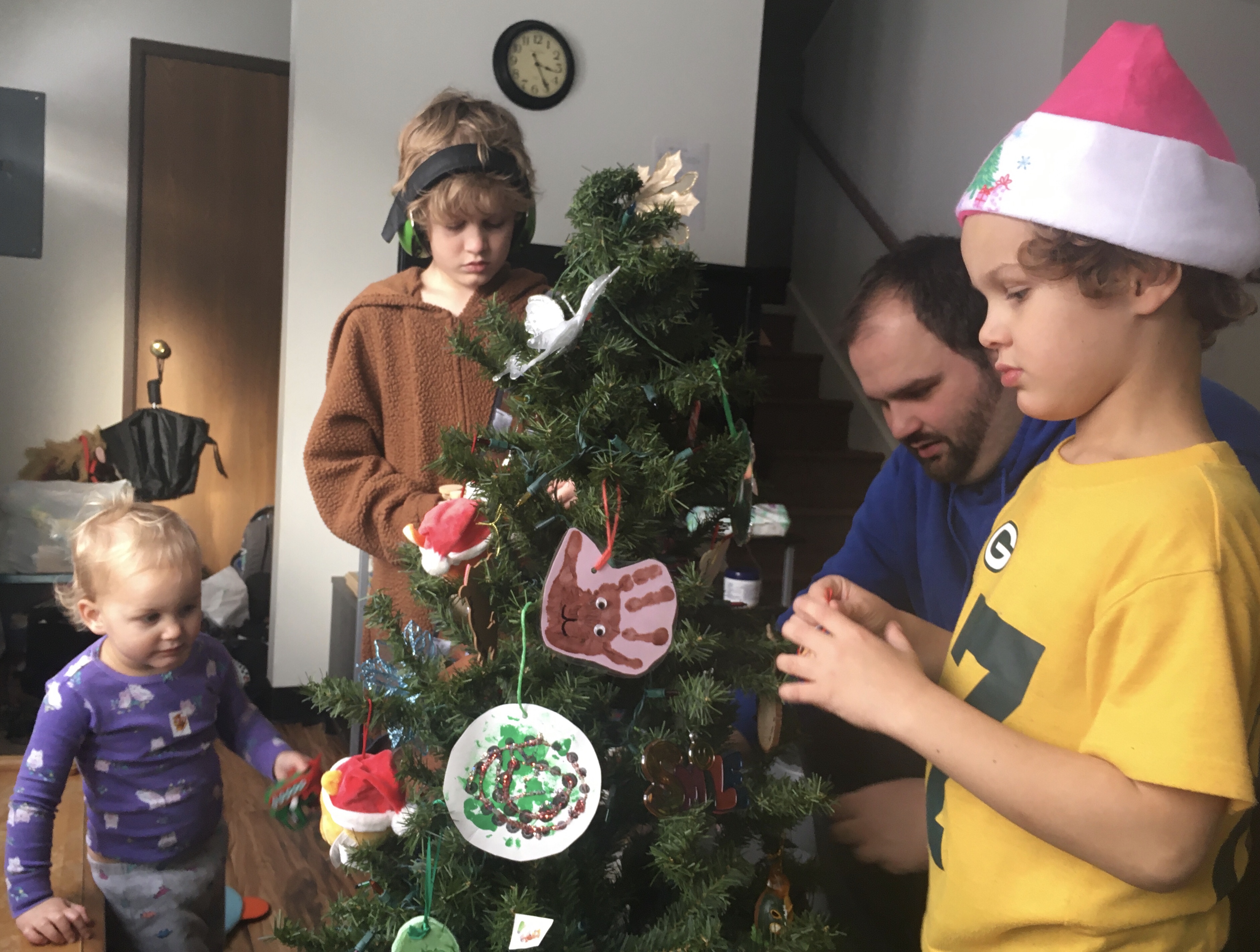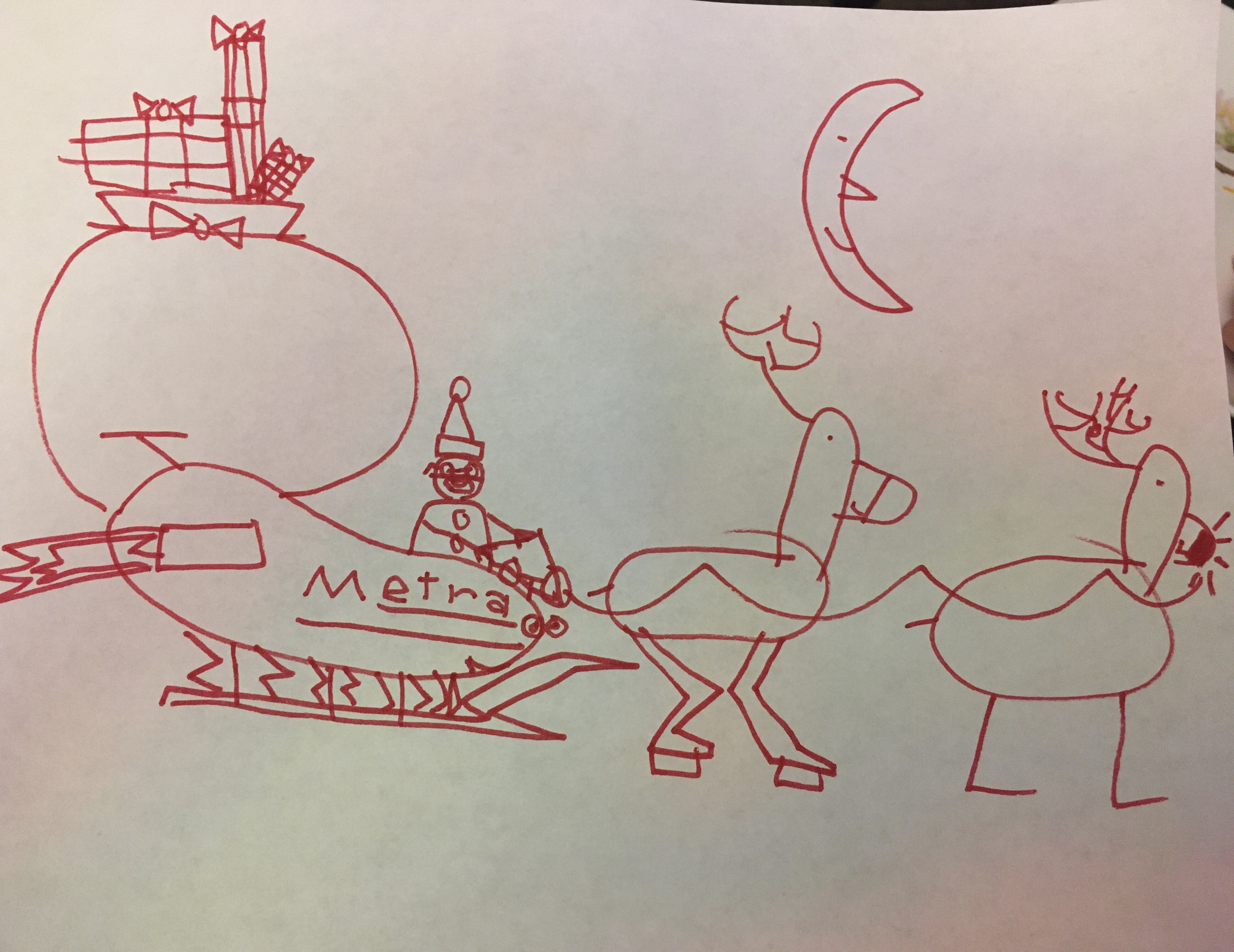 Today he was drawing Santa guiding his reindeer and pulling a sleigh full of presents. Yesterday he was putting X’s through drawing of leaves and circling drawings of snow.